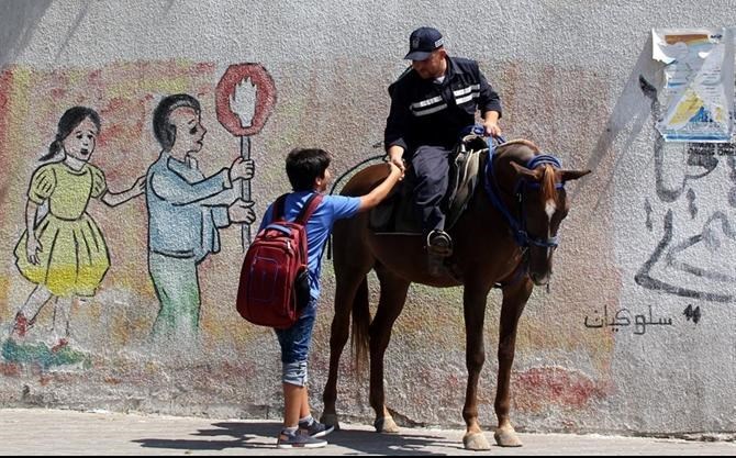 تنتشر شرطة الخيالة بالتزامن مع بدء العام الدراسي الجديد على المفترقات والشوارع الرئيسية المجاورة للمدارس في محافظة غزة وذلك لتأمين الطلاب وتوفير سبل الأمان لهم معطيةً بذلك مظهراً حضارياً.