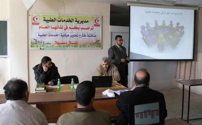ناقش مدراء الإدارات والدوائر والمراكز الطبية بمديرية الخدمات الطبية مقترح مشروع هيكلية المديرية، وذلك في قاعة معهد الإسعاف بمقر المديرية بأنصار غرب مدينة غزة.