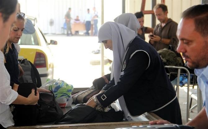 من جانبها تختص الشرطة النسائية المتواجدة على المعبر بتفتيش حقائب وأمتعة النساء المسافرات والتدقيق من شخصية النساء المحجبات.