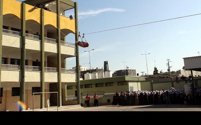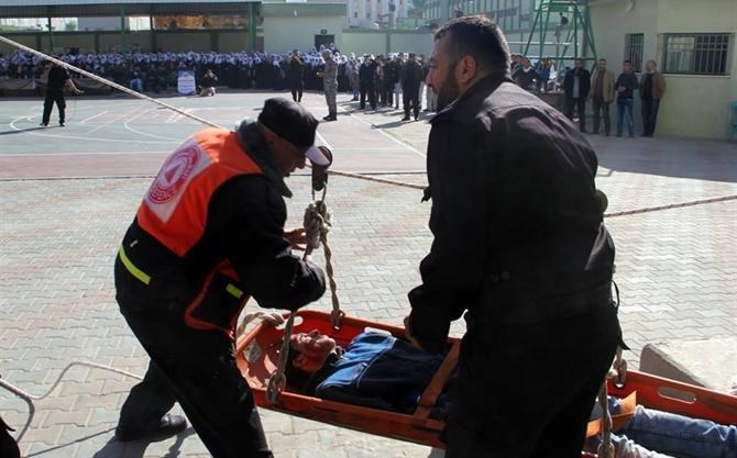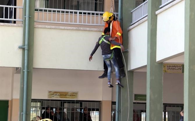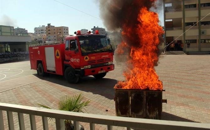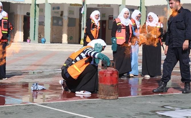 نـفـــذ الدفاع المدني في محافظة شمال غزة مناورة تدريبية لطالبات مدرسة الكويت الثانوية تحاكي عمليات إخلاء وإسعاف وإطفاء الحرائق ومواجهة الكوارث.