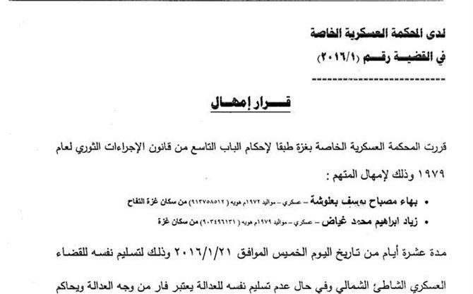 وأكدت المحكمة العسكرية أن المُتهمين بهاء مصباح بعلوشة من مواليد 1972 "عسكري" من سكان مدينة غزة التفاح, والمتهم زياد إبراهيم غياض من مواليد 1979 "عسكري" من سكان مدينة غزة, سيُعدُّان فارين من وجه العدالة في حال عدم تسليم نفسيهما وسيُحاكما غيابياً.