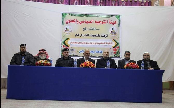 عقدت هيئة التوجيه السياسي والمعنوي بالتعاون مع العلاقات العامة في الشرطة الفلسطينية بمحافظة رفح لقاءً جمع قيادة الشرطة ومخاتير ووجهاء محافظة رفح .