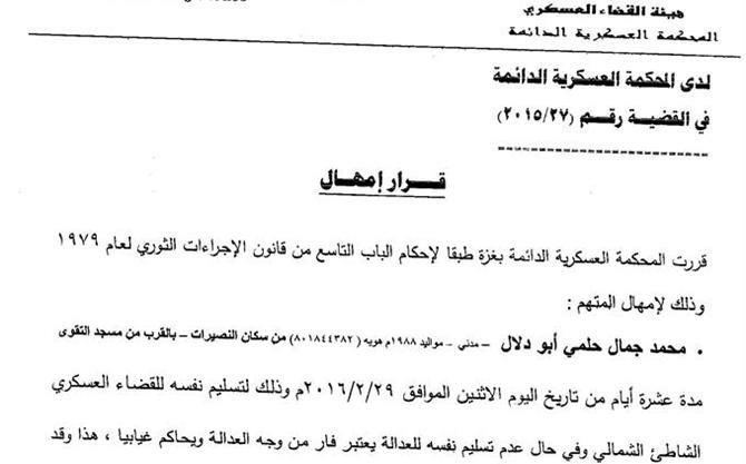 أمهلت المحكمة العسكرية الدائمة التابعة لهيئة القضاء العسكري بوزارة الداخلية والأمن الوطني المتهم محمد جمال حلمي أبو دلال "مدني من مواليد عام 1988" لتسليم نفسه للقضاء العسكري بمدةٍ أقصاها عشرة أيام من تاريخ 29/2/2016.