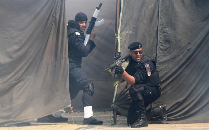وبدأ الاحتفال بعرض المشاة للخريجين, ومن ثم عروض تشكيلات رَسم من خلالها الطلبة بأجسادهم لوحات فنية مميزة, كما تخلل الحفل عروضاً لفض الشغب, بالإضافة لعرض عصا "التنفا" وغيرها من العروض التي تدرب عليها الخريجون خلال الدورات.