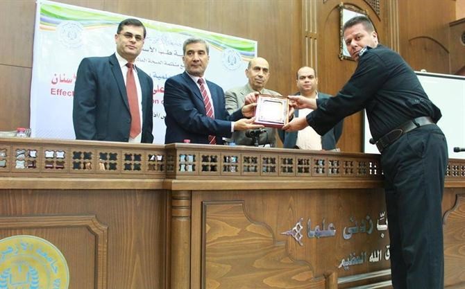 وحضر التكريم – الذي عقد بقاعة هاني الشوا بالجامعة - بحضور عميد الكلية الدكتور محمد مقداد وممثل منظمة الصحة العالمية الدكتور محمود ظاهر.