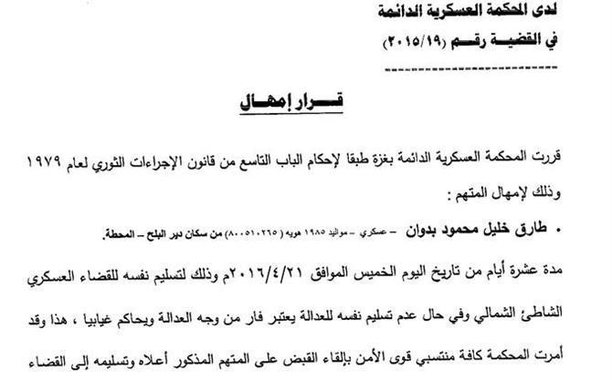 أمهلت المحكمة العسكرية الدائمة التابعة لهيئة القضاء العسكري بغزة المتهم طارق خليل محمود بدوان "عسكري من مواليد 1985 ويحمل هوية رقم 800510265 " لتسليم نفسه للقضاء العسكري بمدةٍ أقصاها عشرة أيام من تاريخ 21/4/2016 م.