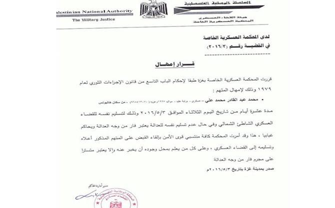 وأكدت المحكمة العسكرية الخاصة أن المتهم من سكان محافظة خان يونس سيُعدُّ فاراً من وجه العدالة في حال عدم تسليم نفسه وسيُحاكم غيابياً.