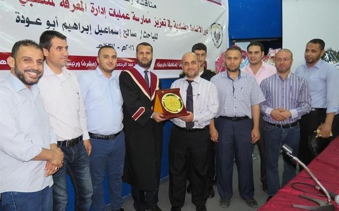 منحت أكاديمية الإدارة والسياسة للدراسات العليا وجامعة الأقصى بغزة أمس الأحد الباحث المقدم صالح إسماعيل أبو عودة مدير وحدة التخطيط والتطوير بهيئة التنظيم والإدارة بوزارة الداخلية درجة الماجستير عن أُطروحته التي بعنوان "دور الأنماط القيادية في تعزيز ممارسة عمليات إدارة المعرفة لمنتسبي قوي الأمن الفلسطيني".