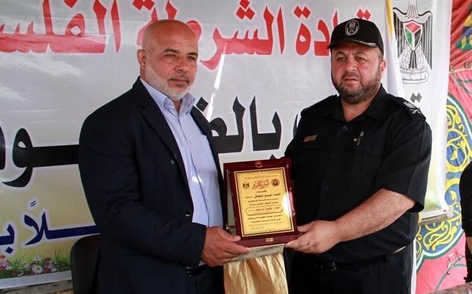 وفي ختام الحفل قدم اللواء البطش درع الشكر للواء توفيق أبو نعيم على رعايته الكريمة في متابعة إعادة ترميم مباني جهاز الشرطة مادياً ومعنوياً.