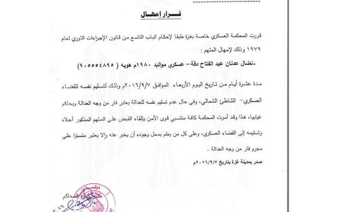 أمهلت المحكمة العسكرية الخاصة بغزة التابعة لهيئة القضاء العسكري المتهم نضال عدنان عبد الفتاح دقة "عسكري من مواليد 1980 ويحمل هوية رقم 905554895 لتسليم نفسه للقضاء العسكري بمدةٍ أقصاها عشرة أيام من تاريخ 7/9/2016 م.