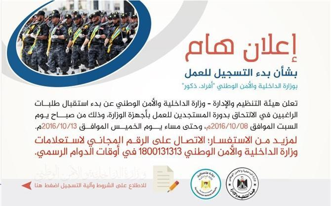 تعلن هيئة التنظيم والادارة بوزارة الداخلية والأمن الوطني عن بدء استقبال طلبات الراغبين بالالتحاق في دورة المستجدين للعمل بوزارة الداخلية والامن الوطني للعام 2016 وذلك حسب الشروط التالية:-