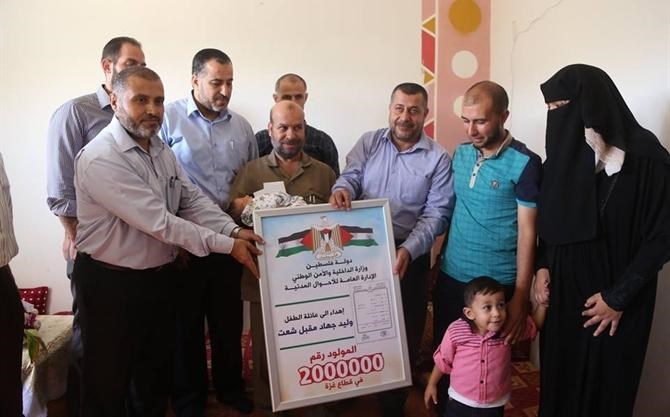 زار وفد من قيادة وزارة الداخلية _الشق المدني_ عائلة الطفل وليد جهاد شعت صاحب رقم ال "2" مليون من سكان قطاع غزة، بمنزلهم بمنطقة قيزان النجار جنوب قطاع غزة.