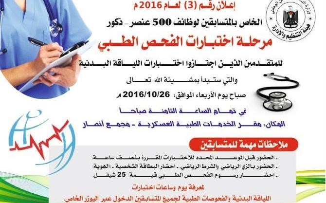 أعلنت هيئة التنظيم والإدارة بوزارة الداخلية والأمن الوطني عن موعد إجراء الفحص الطبي، للمتسابقين المتقدمين لوظيفة أفراد للعام 2016م.