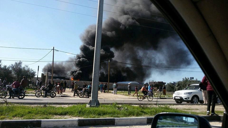 طواقم الدفاع المدني بمحافظة خان يونس مساء اليوم من إخماد حريق كبير نشب في أحد المخازن