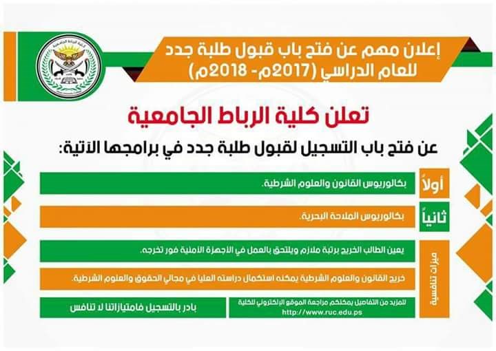 أعلنت كلية الرباط التابعة لوزارة الداخلية عن فتح باب القبول والتسجيل للالتحاق ببرنامج بكالوريوس القانون والعلوم الشرطية وبكالوريوس الملاحة البحرية للعام الدراسي 2017 – 2018م.