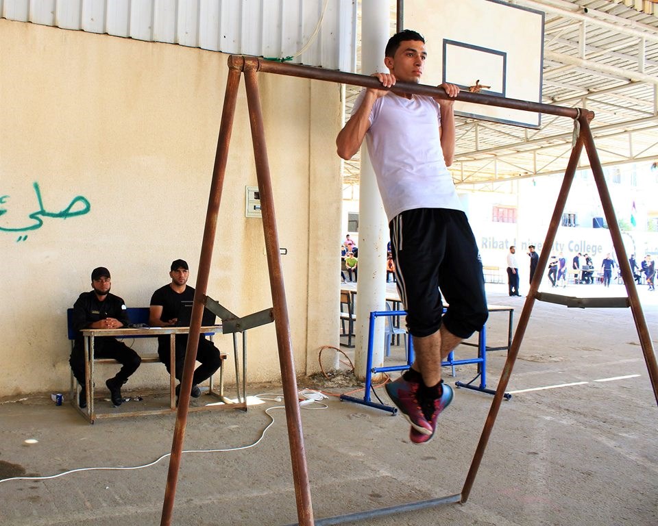 واختبار عقلة (تعلُّق) لقياس قوة الاكتاف الذراعين، اختبار معدة، ضغط صدر، إضافة لجري