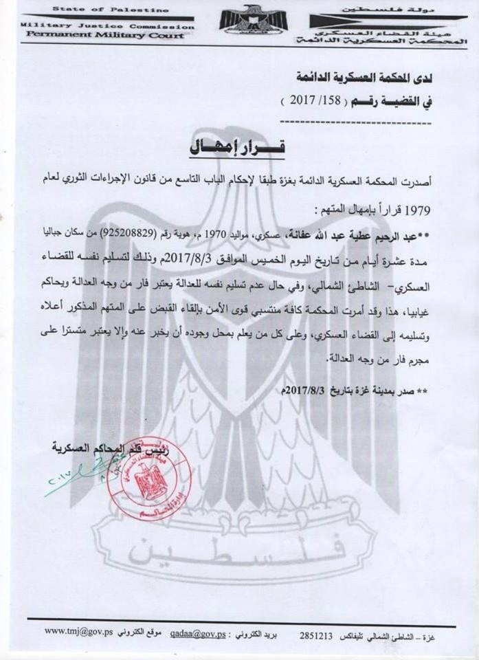 عفانة ويحمل هوية رقم ( 925208829) من سكان جباليا، عشرة أيام من تاريخ يوم الخميس3/8/2017،