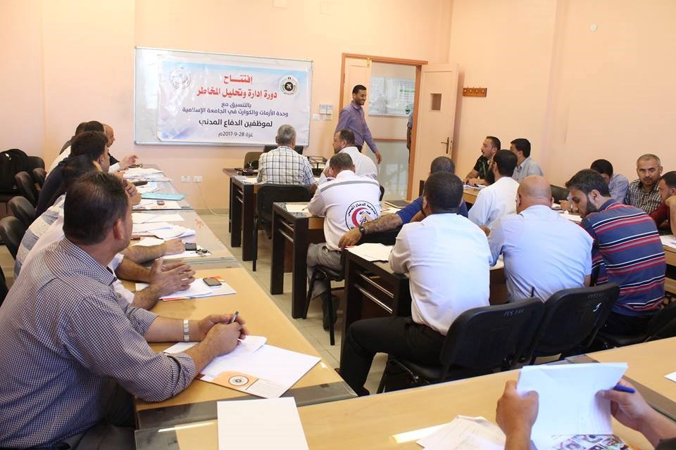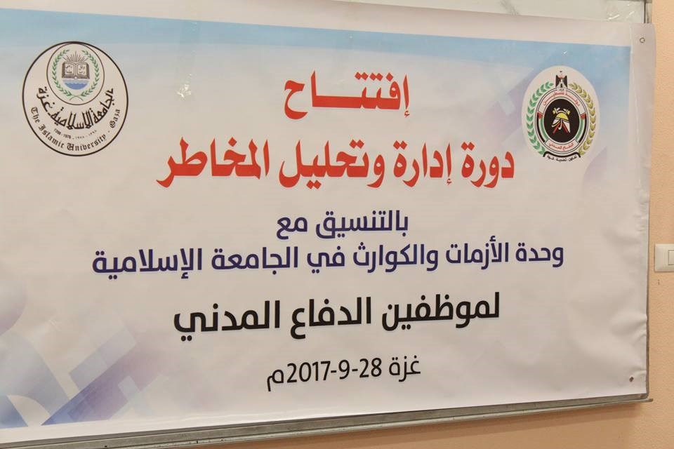 الأزمات والكوارث في الجامعة الإسلامية واستهدفت 35 من كوادر وضباط مديرية الدفاع المدني.