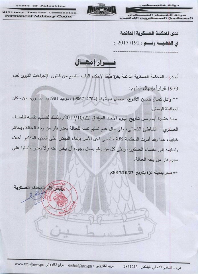 أمهلت المحكمة العسكرية الدائمة التابعة لهيئة القضاء العسكري المتهم وائل كمال حسن الأقرع ويحمل هوية(906714704 ) من مواليد عام 1981من سكان الوسطى، عشرة أيام من تاريخ يوم أمس الأحد لتسليم نفسه للقضاء العسكري.