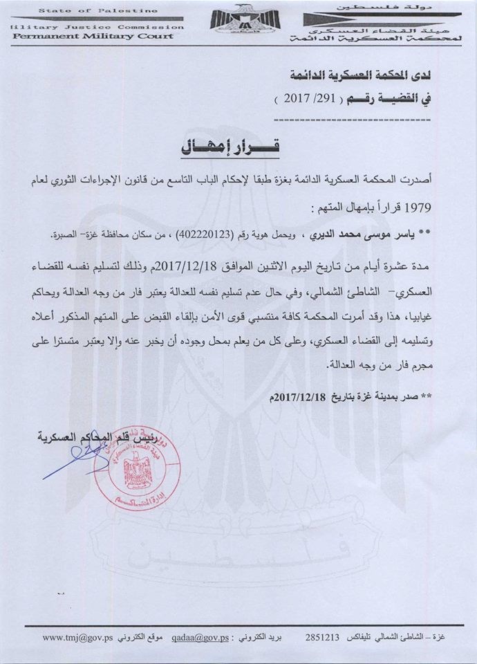 محافظة غزة - الصبرة عشرة أيام من تاريخ يوم الاثنين لتسليم نفسه للقضاء العسكري.