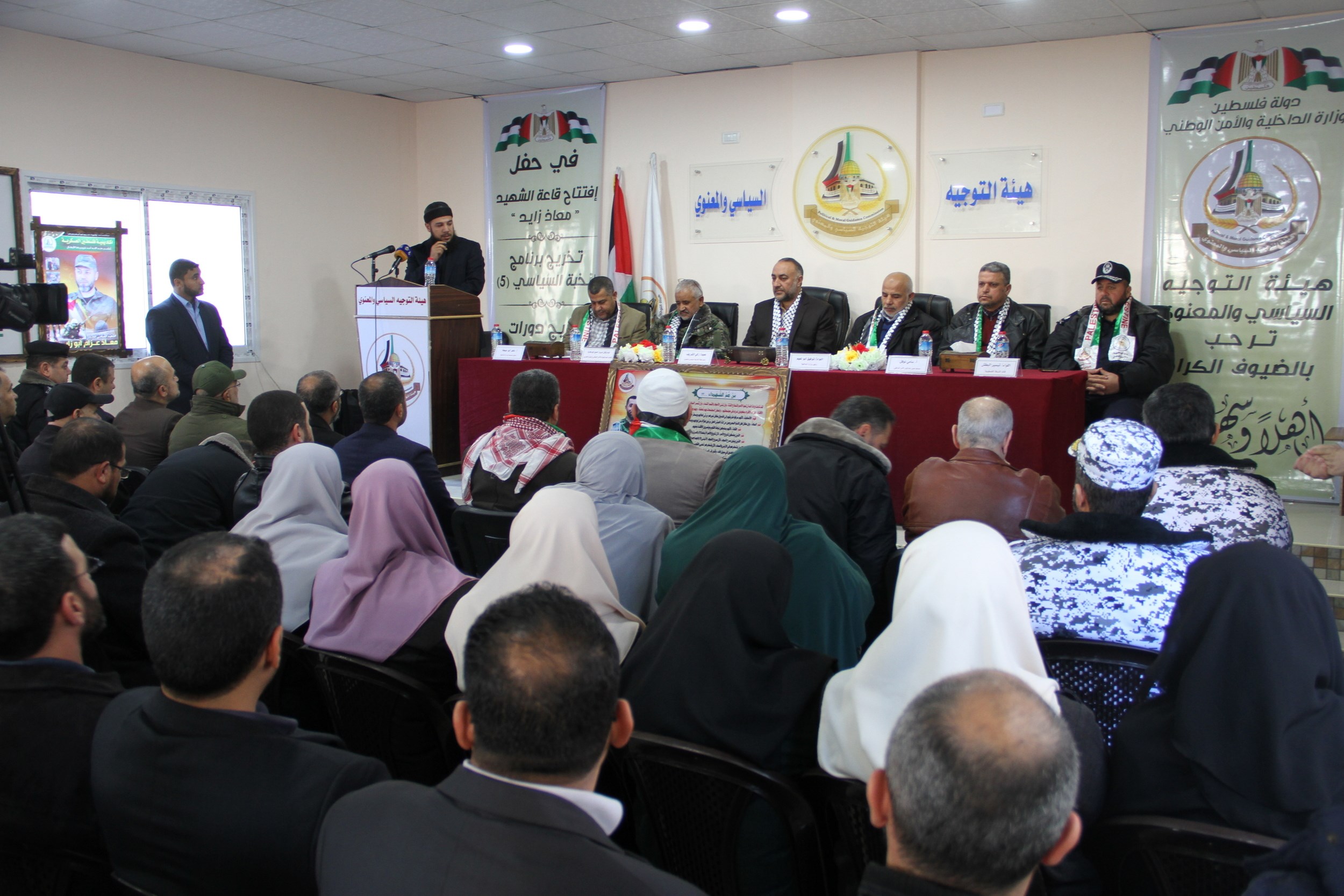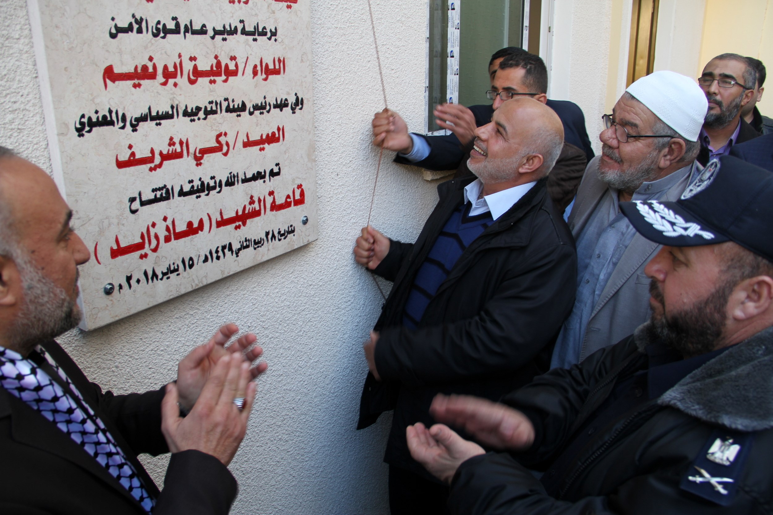 وأكد أن الهدف الرئيسي من افتتاح قاعة الشهيد معاذ زايد هو لعقد الدورات التوعوية والتربوية والعقائدية والقرآنية لضباط وأفراد وزارة الداخلية والأمن الوطني، مضيفًا "أن الله عز وجل يحب زيادة البسطة في العلم والجسد".