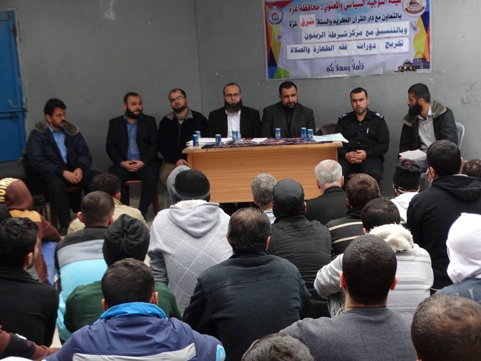 خرجت هيئة التوجيه السياسي والمعنوي محافظة غزة مجموعة دورات في فقه الطهارة والصلاة لـ100 نزيلًا من مركز شرطة الزيتون وذلك بالتعاون مع دار القرآن الكريم والسنة.