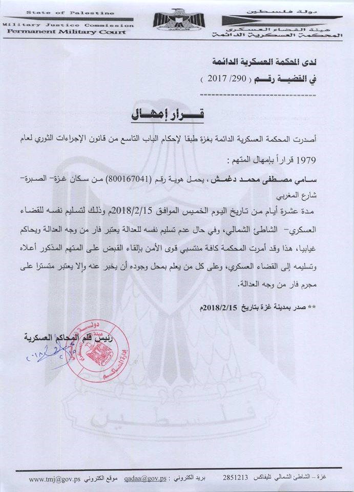 أمهلت المحكمة العسكرية الدائمة التابعة لهيئة القضاء العسكري المتهم سامي مصطفى محمد دغمش ويحمل هوية(800167041) من سكان محافظة غزة -الصبرة -شارع المغربي