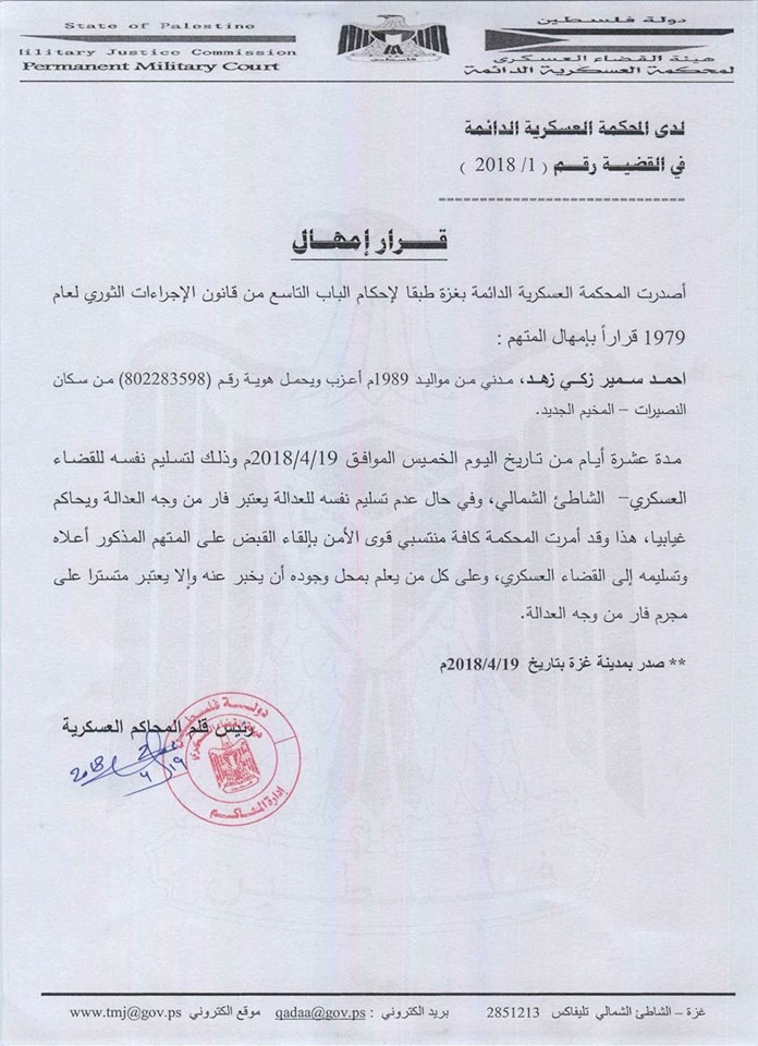 أيام من تاريخ يوم الخميس الموافق 19/4/2018لتسليم نفسه للقضاء العسكري.