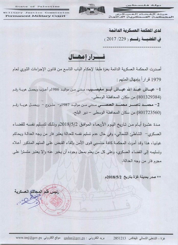 الوسطى عشرة أيام من تاريخ يوم الاربعاء الموافق 2/5/2018لتسليم انفسهم للقضاء العسكري.