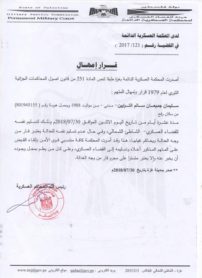 من مواليد 1988، عشرة أيام من تاريخ يوم الاثنين الموافق 30/7/2018 لتسليم نفسه للقضاء