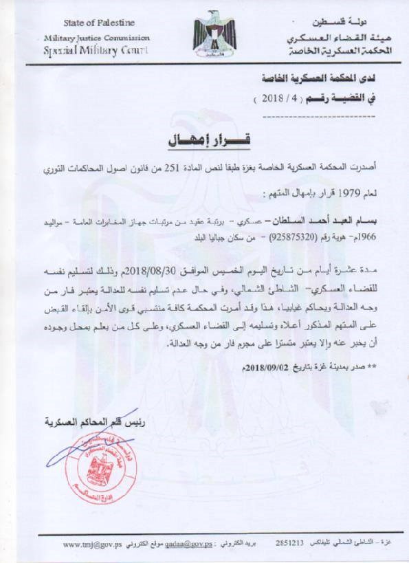 لهيئة القضاء العسكري المتهم بسام العبد أحمد السلطان من جباليا البلد ويحمل هوية (925875320)،