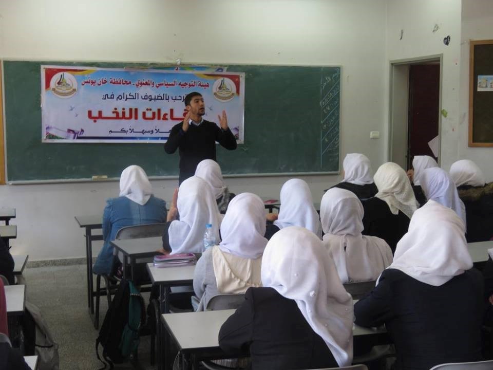 في محافظة خانيونس لقاء لنخب طالبات مدرستي جرار القدوة الثانوية و بيت المقدس الثانوية، حول