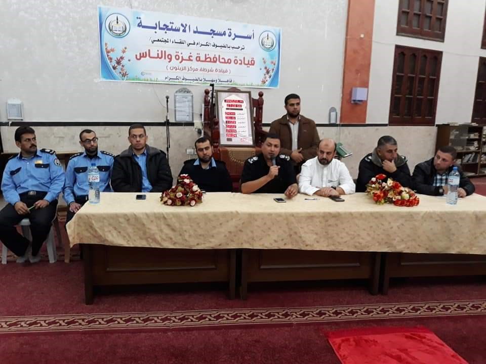 عقد مركز شرطة الزيتون جنوب مدينة غزة لقاءً جماهيرياً بعنوان "الشرطة والناس" في مسجد الاستجابة بهدف التواصل بين الشرطة والناس وتفعيل دور الشرطة المجتمعية .