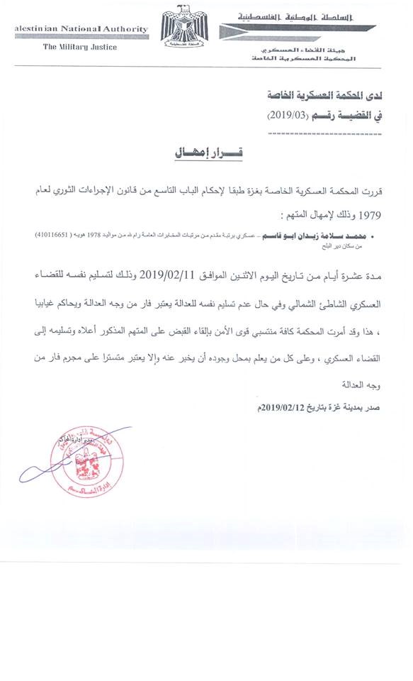 المحكمة على أنه في حال عدم تسليم نفسه للعدالة ويعتبر فار من وجه العدالة وسيحاكم غيابياً.