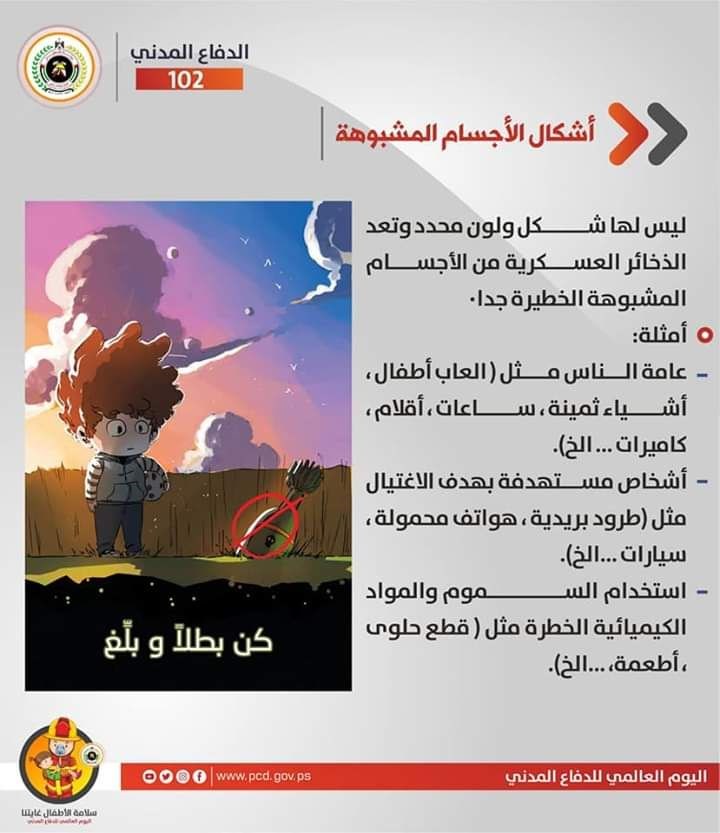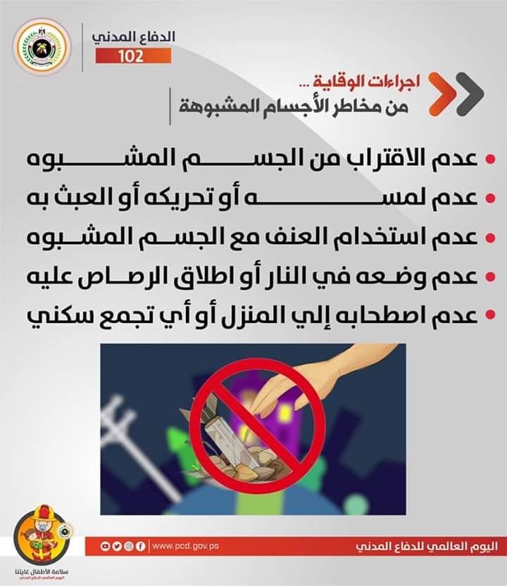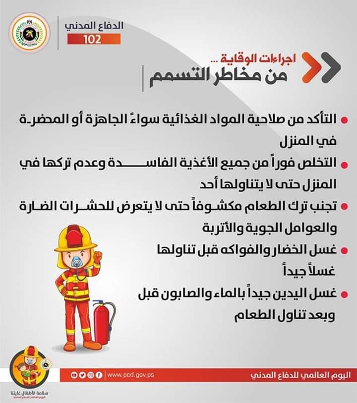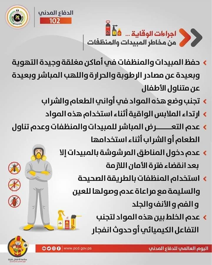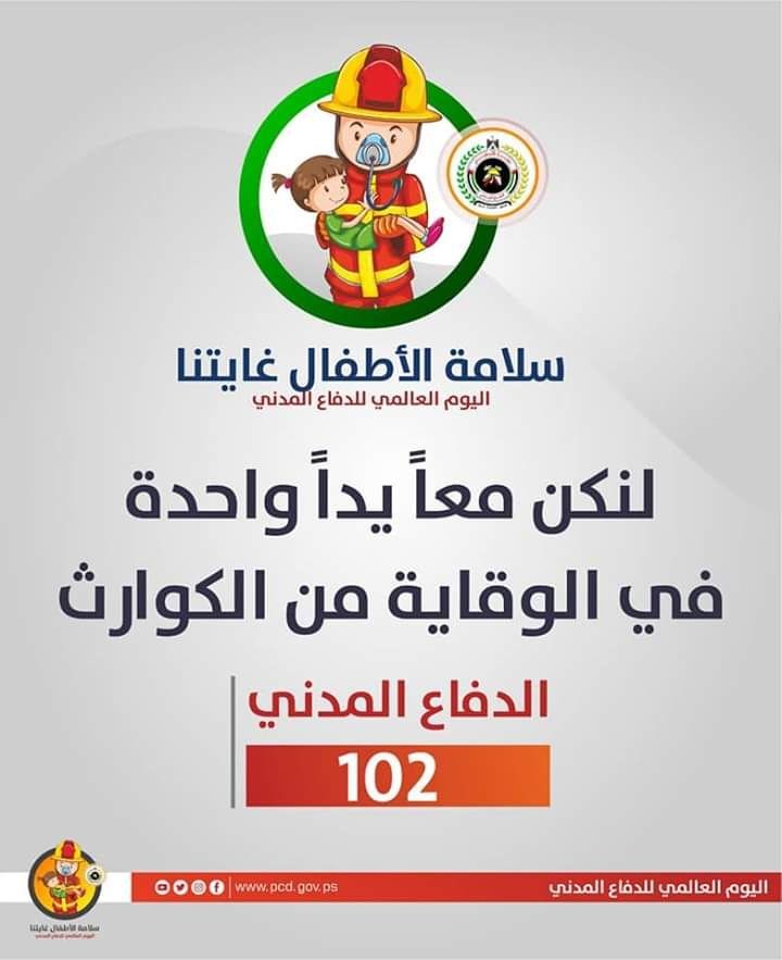 نشرت إدارة العلاقات العامة والإعلام في مديرية الدفاع المدني الفلسطيني تعليمات وإرشادات الوقاية والسلامة في الحوادث المختلفة تحت عنوان "سلامة الأطفال غايتنا".