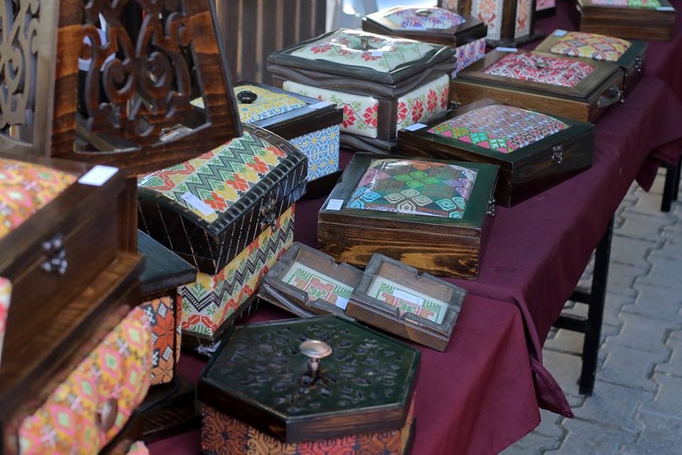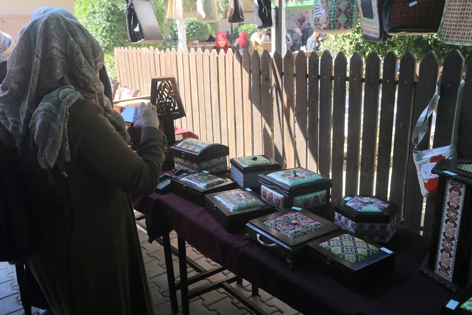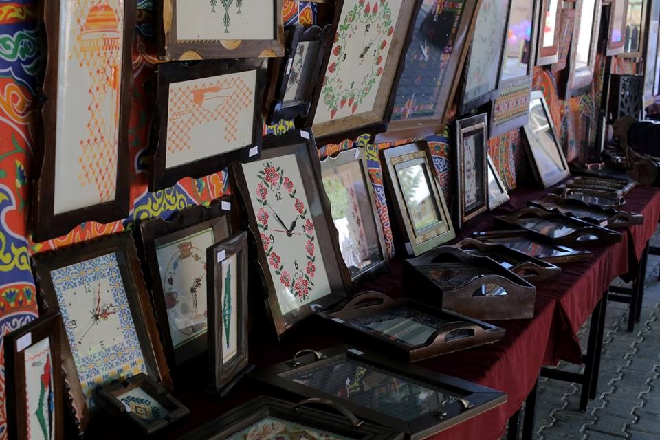 وحقائب مطرزة، إلى جانب براويز وأشكال فنية وساعات وخرائط، وغيرها من المشغولات اليدوية،