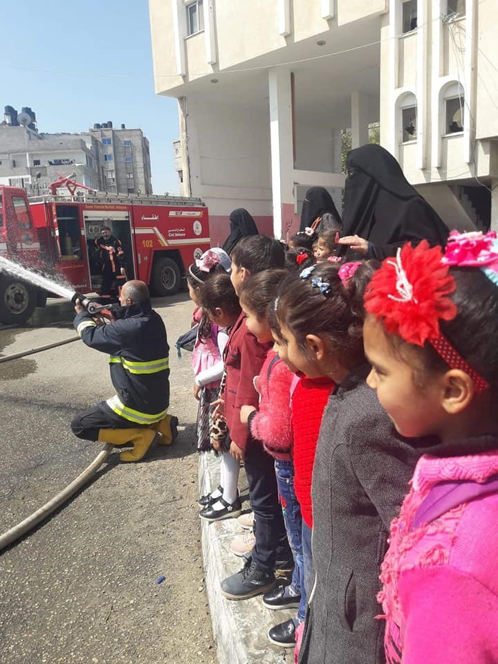 أفراد طاقم التدريب في دفاع مدني رفح، الأطفال على مخاطر المواد المشتعلة والخطرة كالغاز والبنزين