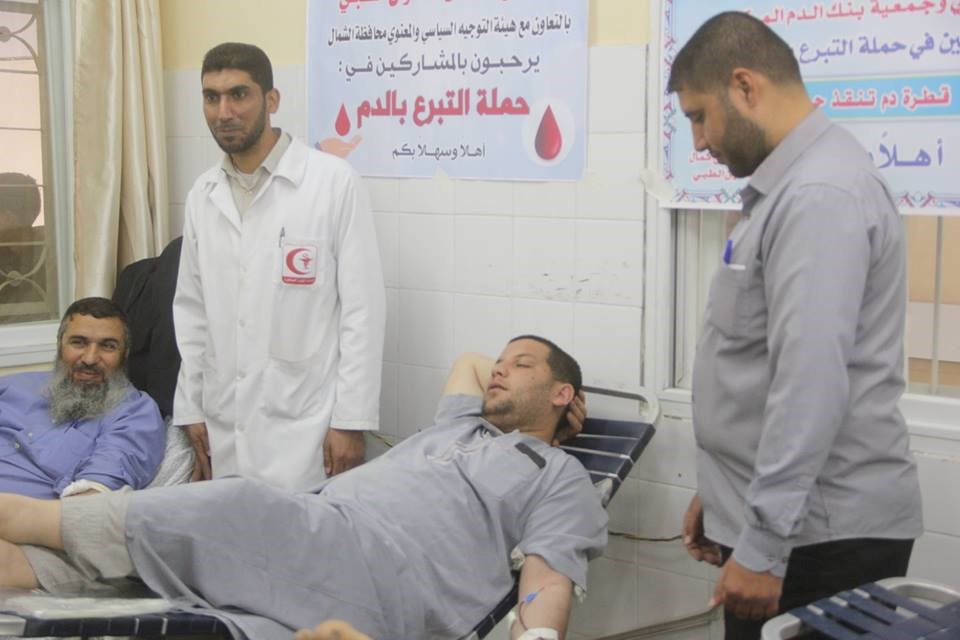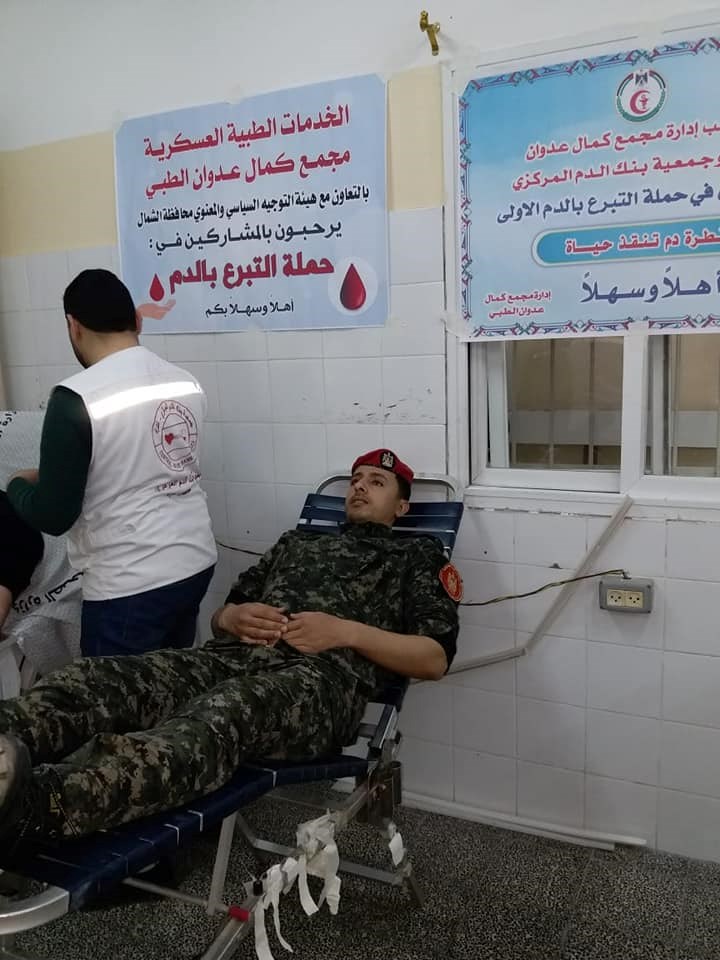 نظم مجمع كمال عدوان الطبي التابع للخدمات الطبية العسكرية بالتعاون مع هيئة التوجيه السياسي والمعنوي، أمس الثلاثاء، حملة للتبرع بالدم بعنوان " قطرة دم تنقذ حياة " بمقر المجمع شمال غزة.