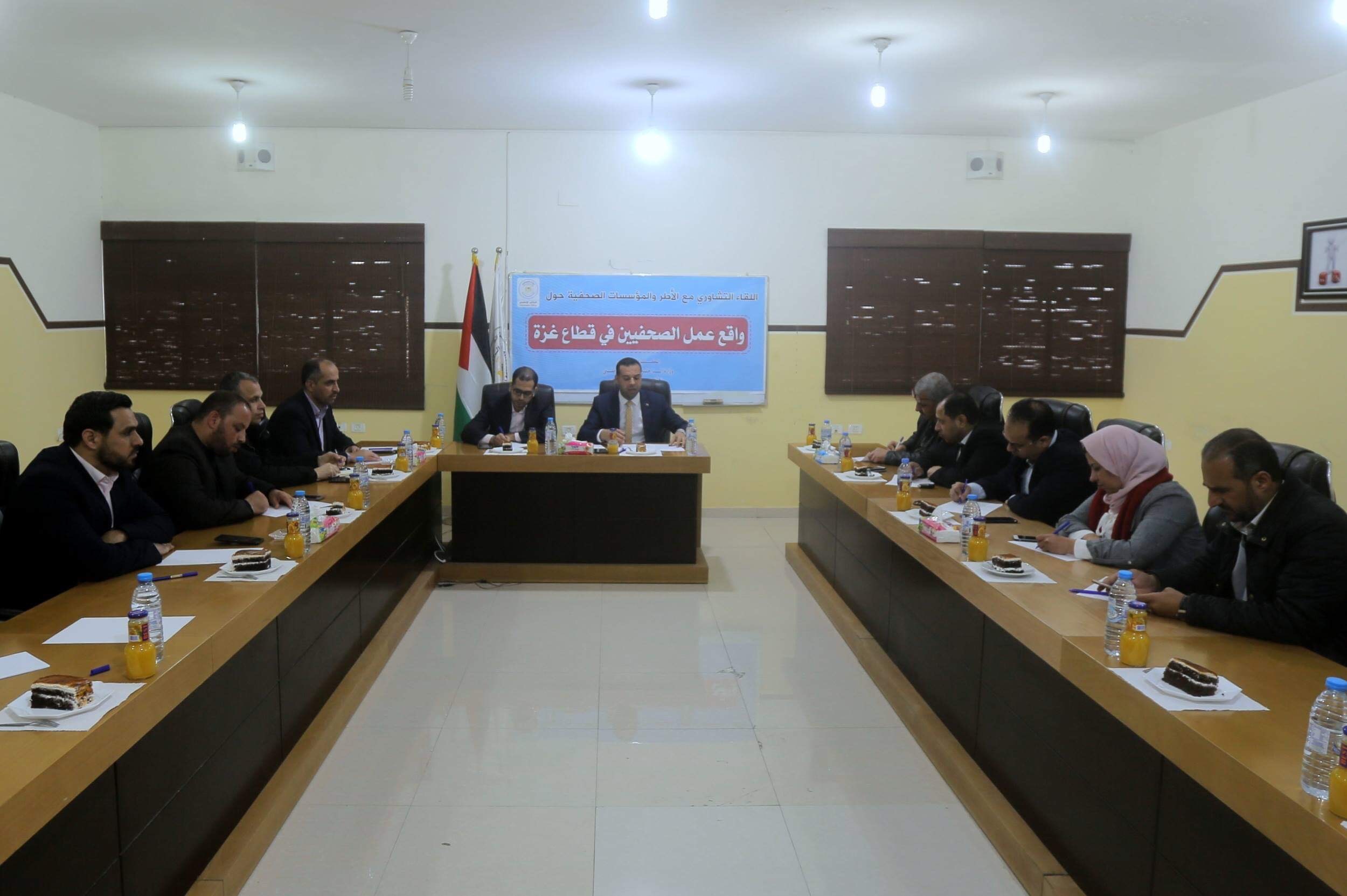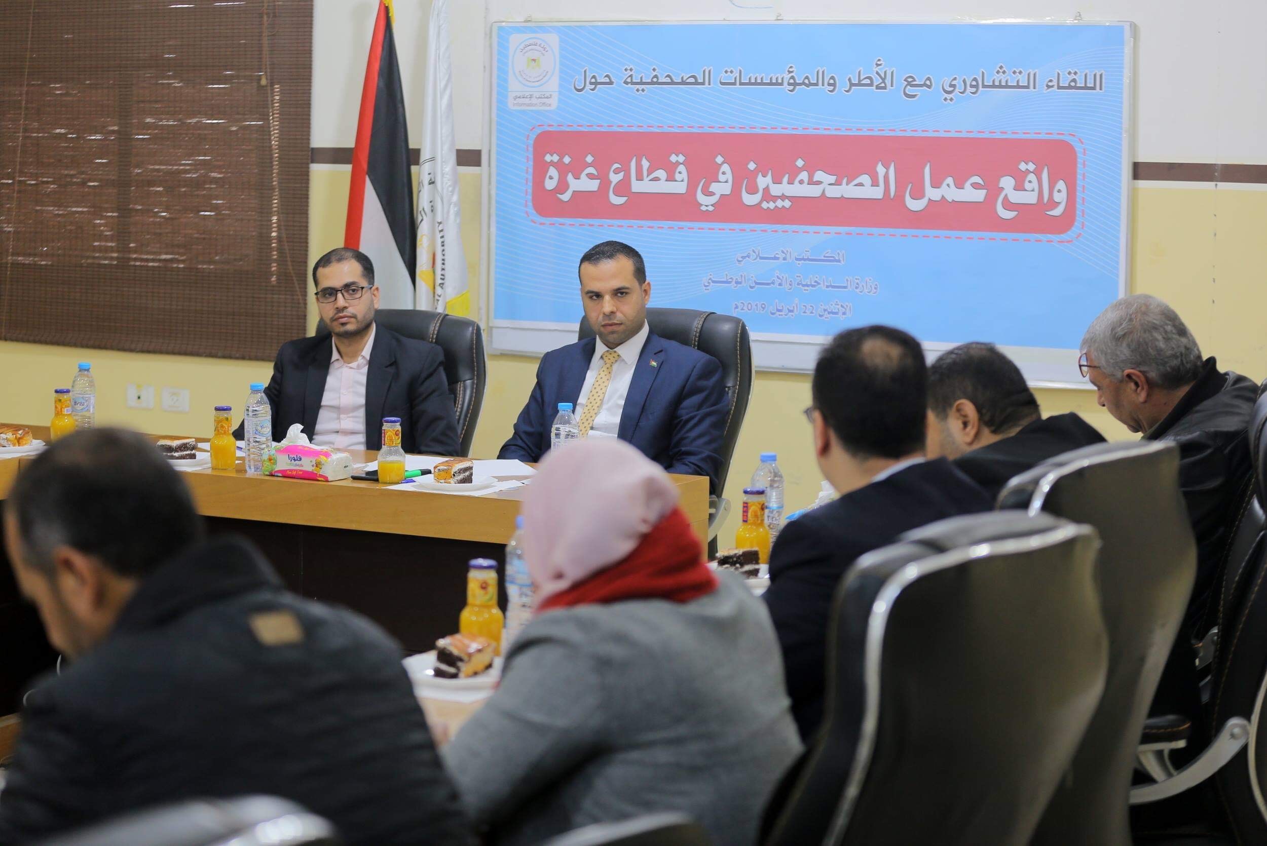 حيث التقى المتحدث باسم وزارة الداخلية ومدير المكتب الإعلامي أ. إياد البزم مع عدد من رؤساء الأطر والمؤسسات الصحفية العاملة في غزة: أ. فتحي صباح مدير المركز الفلسطيني للاتصال والتنمية، ود. خضر الجمالي رئيس منتدى الإعلاميين، وأ. صالح المصري رئيس لجنة دعم الصحفيين، وأ. منى خضر مدير مؤسسة فلسطينيات، وأ. عادل الزعنون مدير مركز الدوحة لحرية الإعلام، بالإضافة إلى أ. بلال جاد الله مدير مؤسسة بيت الصحافة، وأ. وسام زغبر رئيس التجمع الإعلامي الفلسطيني، وأ. أحمد زغبر رئيس كتلة الصحفي.