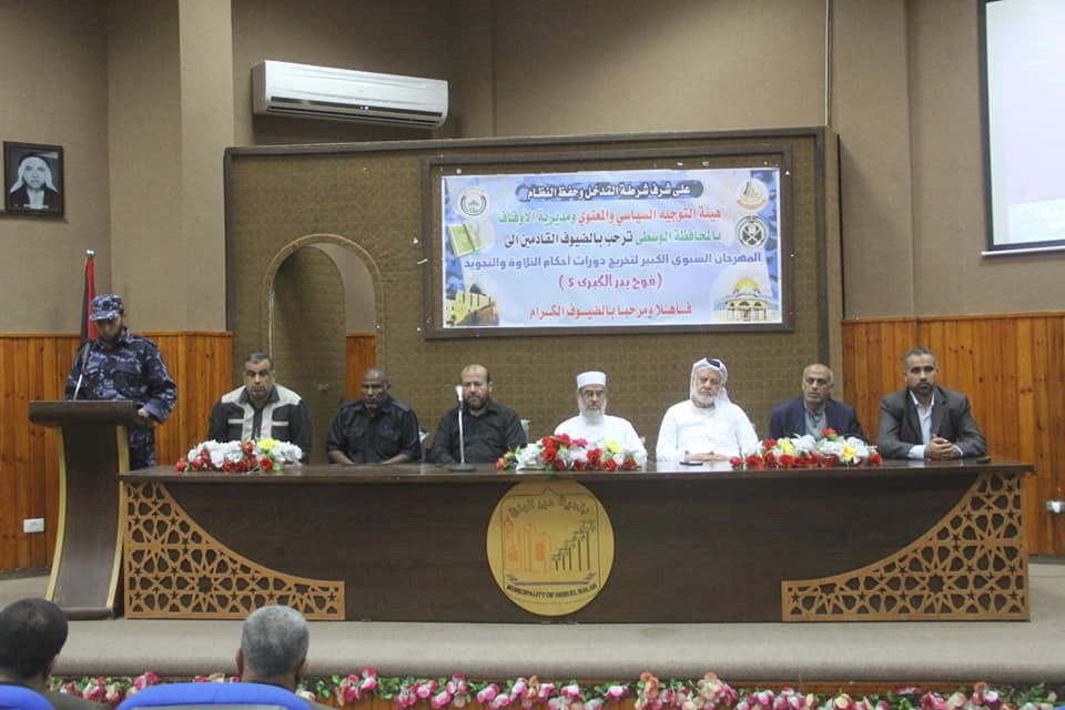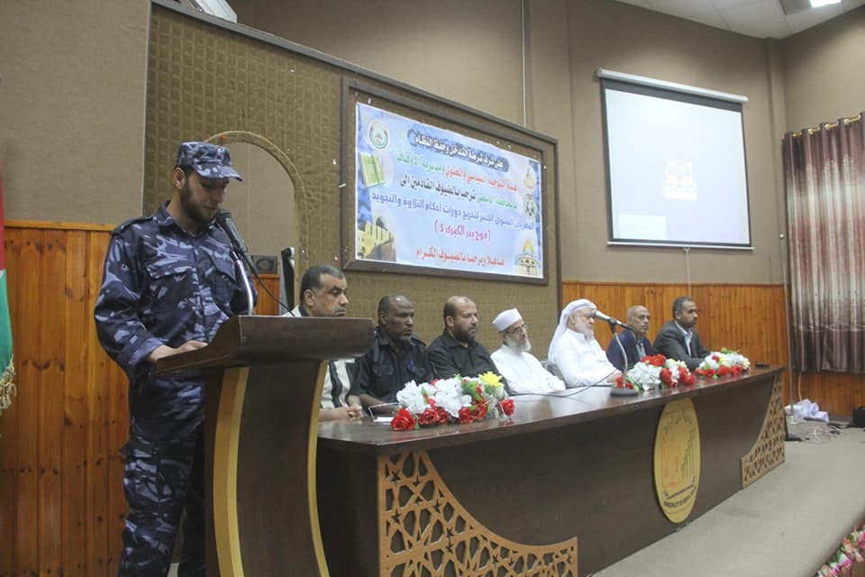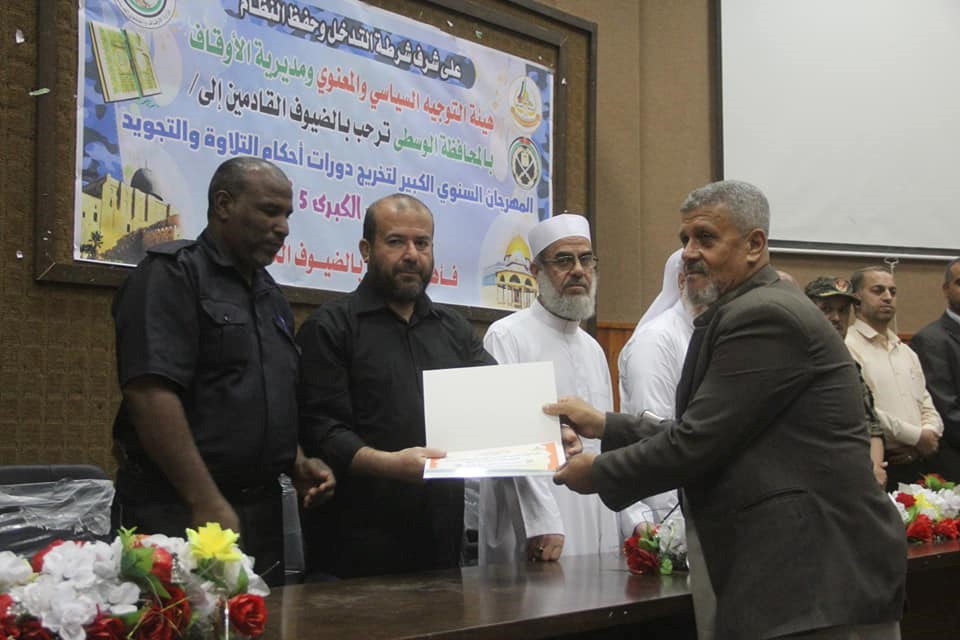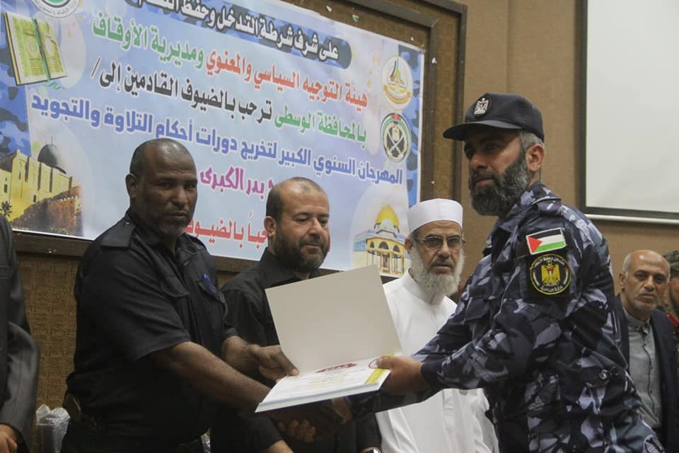 نظمت هيئة التوجيه السياسي والمعنوي في المحافظة الوسطى وبمشاركة مديرية الأوقاف بالمحافظة المهرجان السنوي لتخريج دورات الأحكام والتلاوة والتجويد "فوج بدر الكبرى 5"، بحضور النواب في المجلس التشريعي النائب عبد الرحمن الجمل والنائب سالم سلامة ومدير عام شرطة المحافظة الوسطى العقيد اسماعيل أبو راشد ونائب هيئة التوجيه السياسي العقيد محمد الجريسي وجميع مدراء الأجهزة الأمنية والشرطية في المحافظة الوسطى.