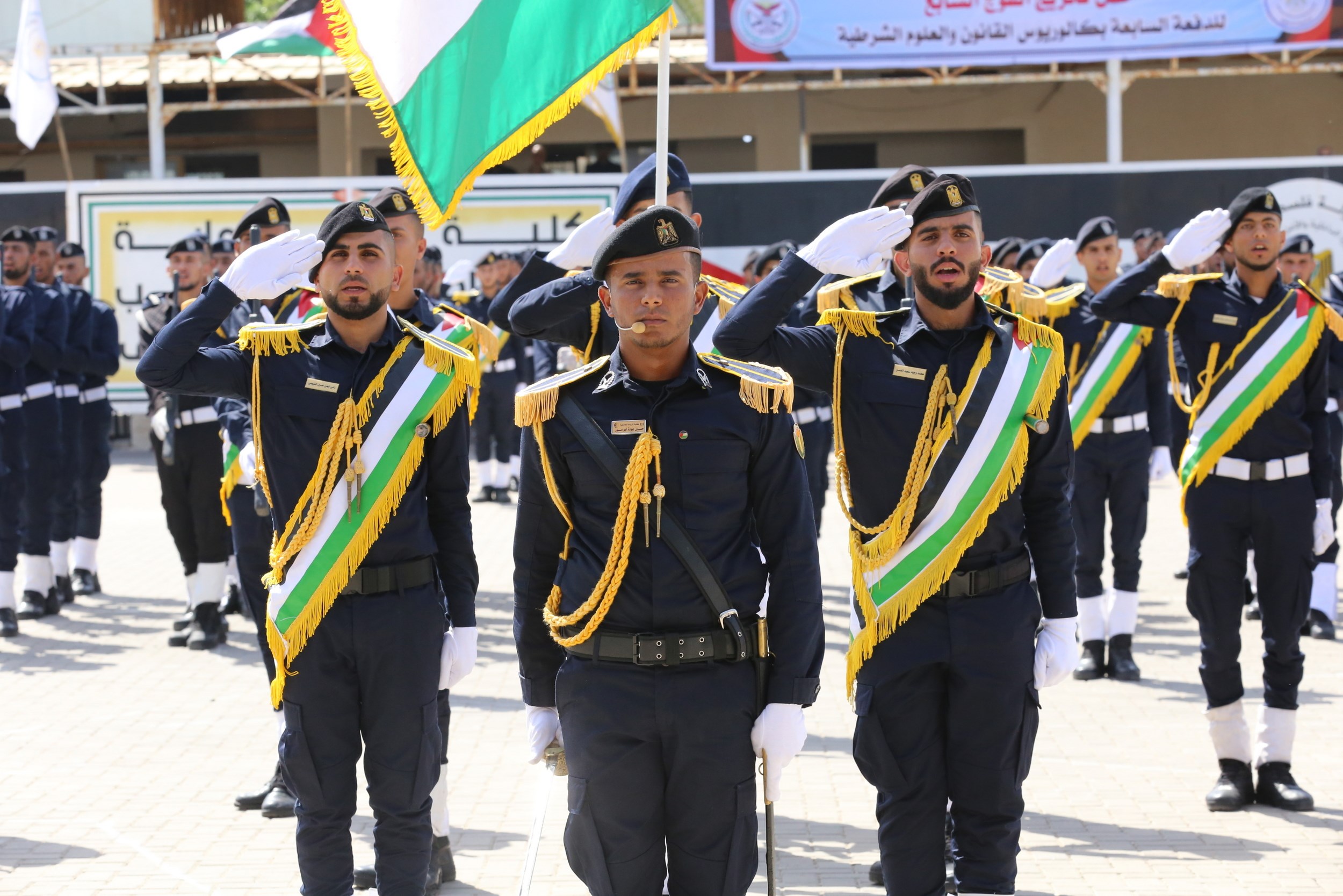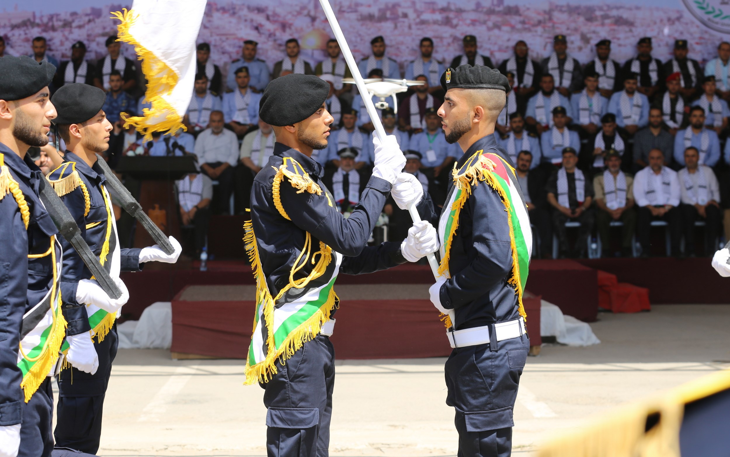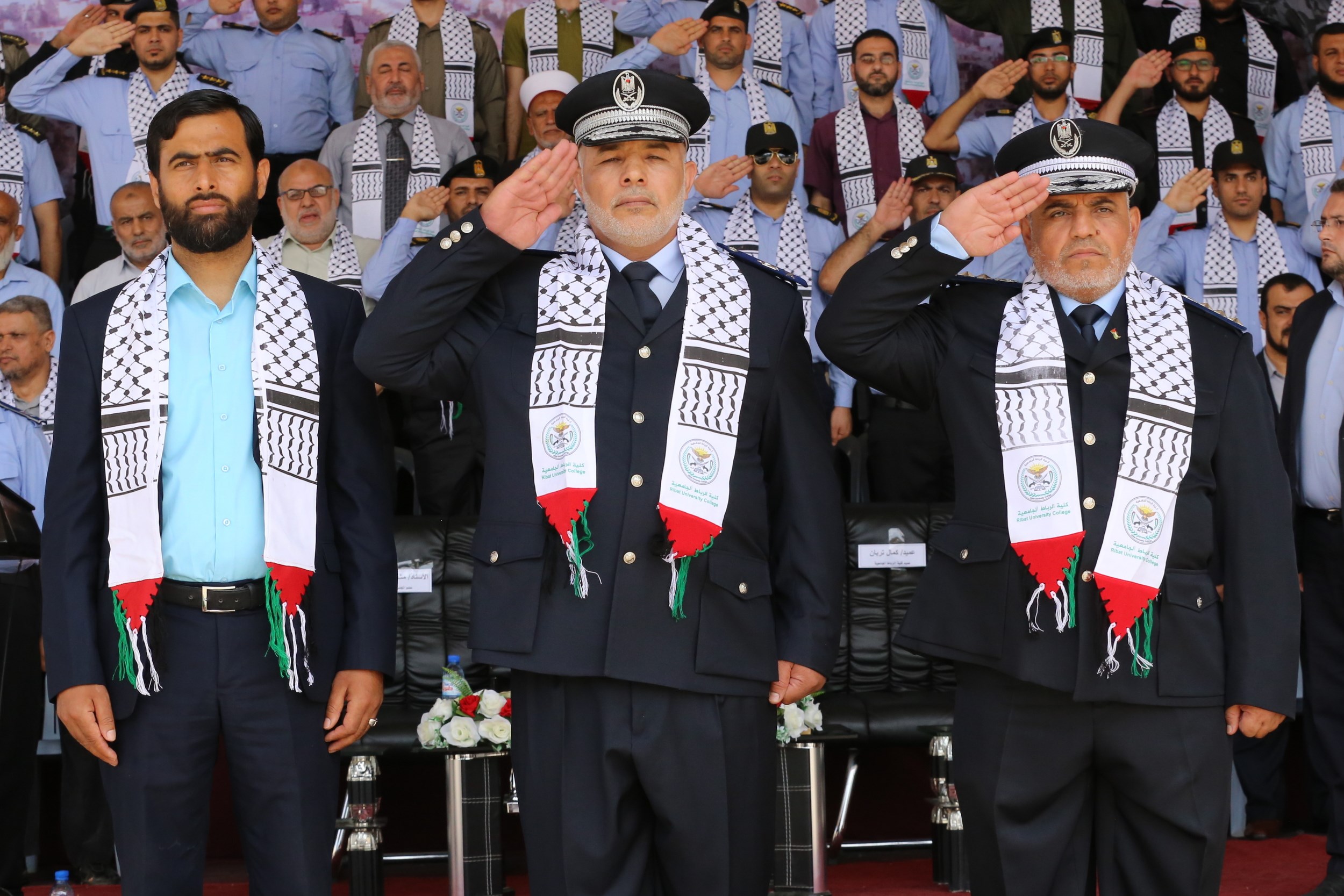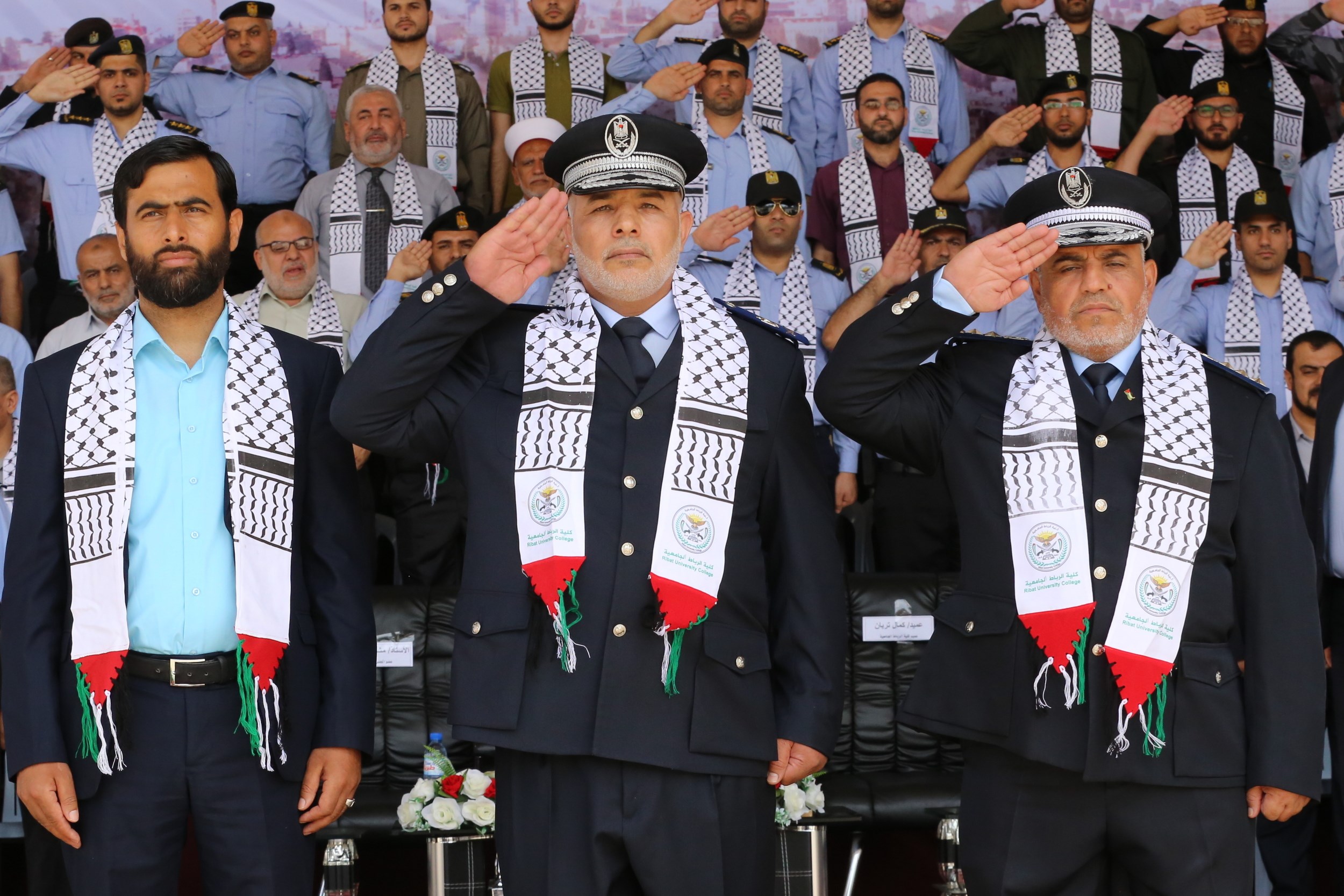 الطلاب وقادة الأجهزة الأمنية في ختام الحفل التحية للسلام الوطني الفلسطيني.
