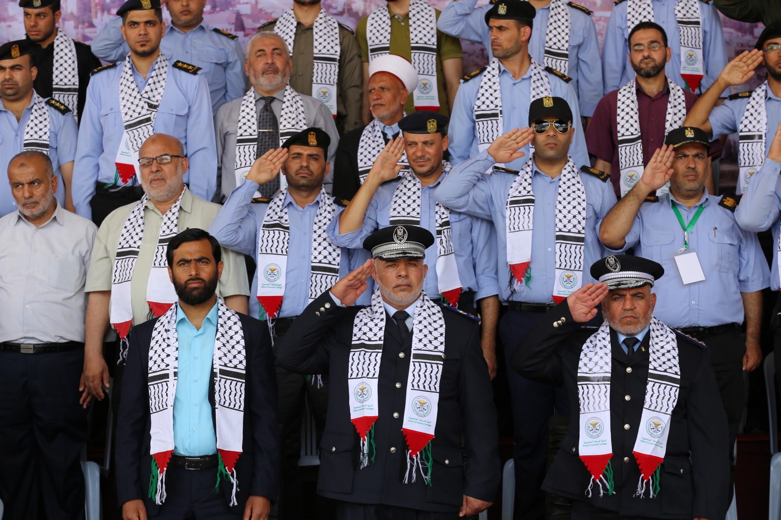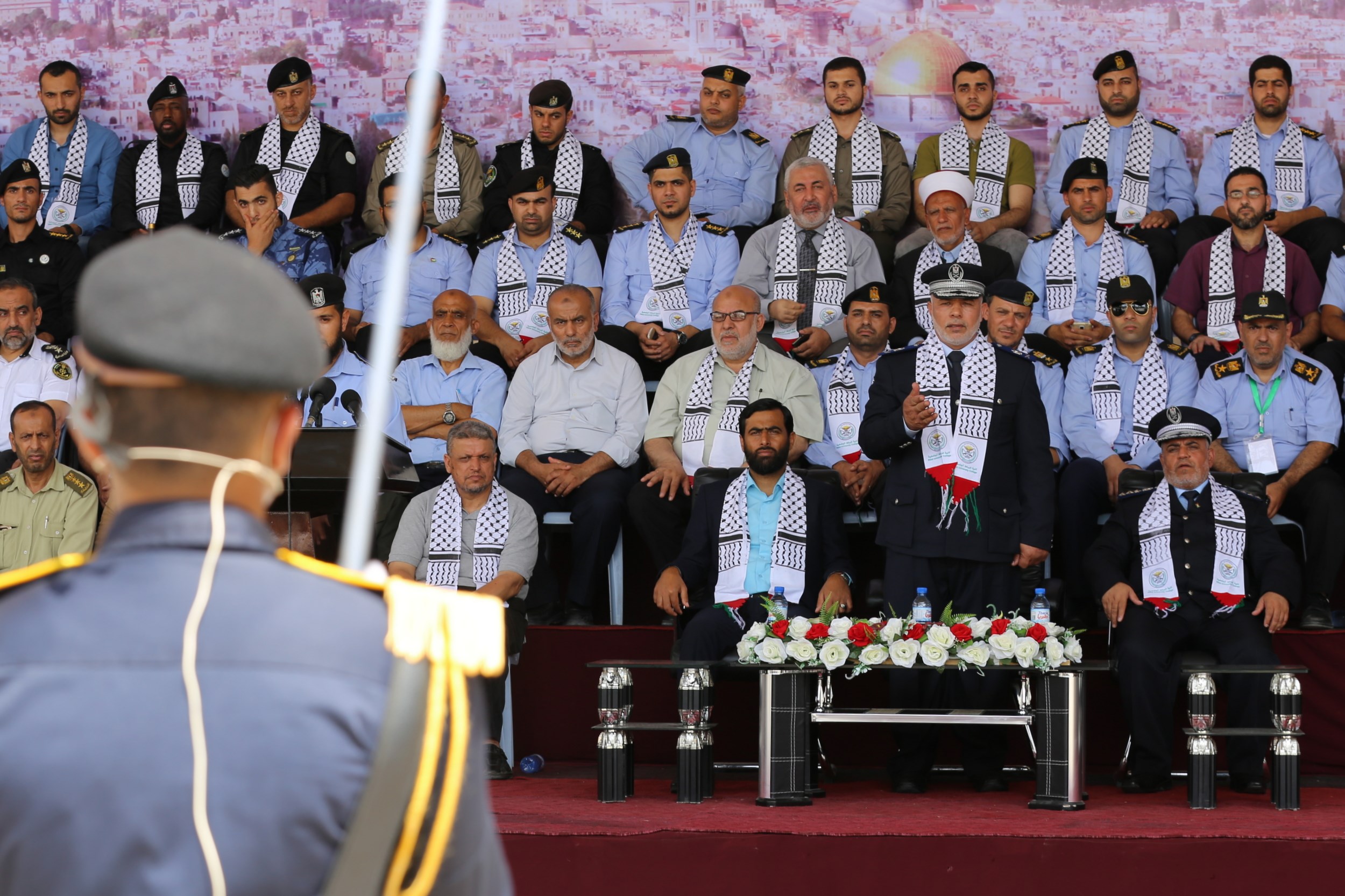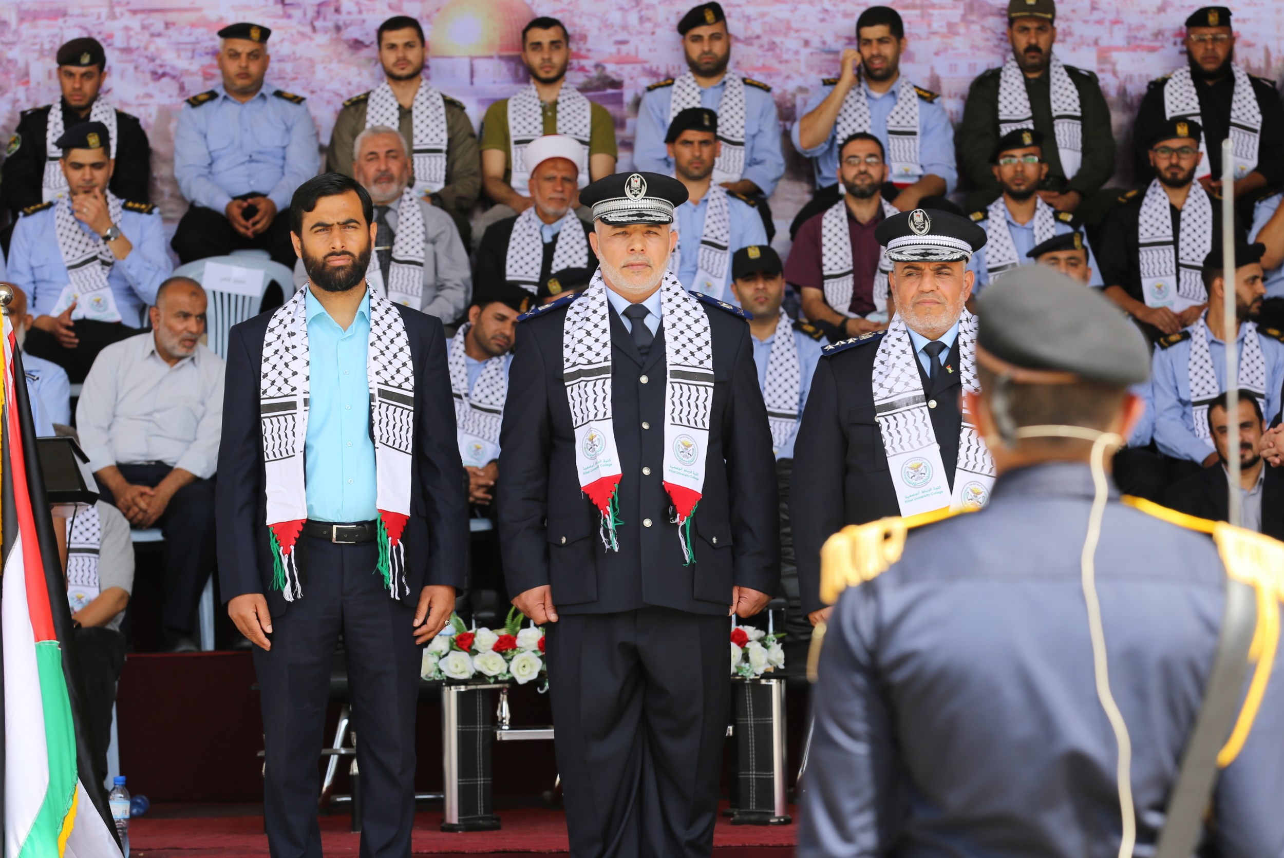 الطلاب وقادة الأجهزة الأمنية في ختام الحفل التحية للسلام الوطني الفلسطيني.