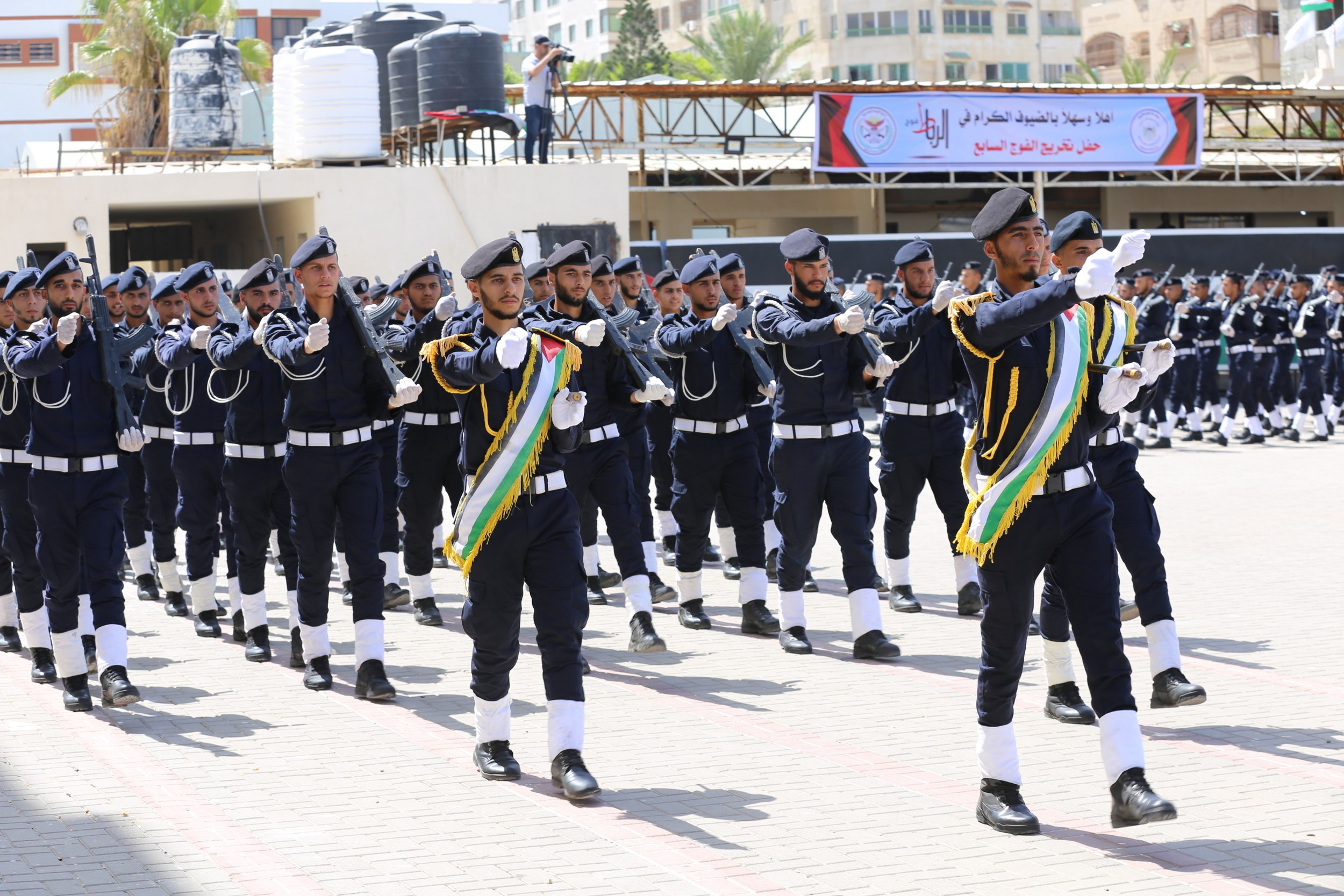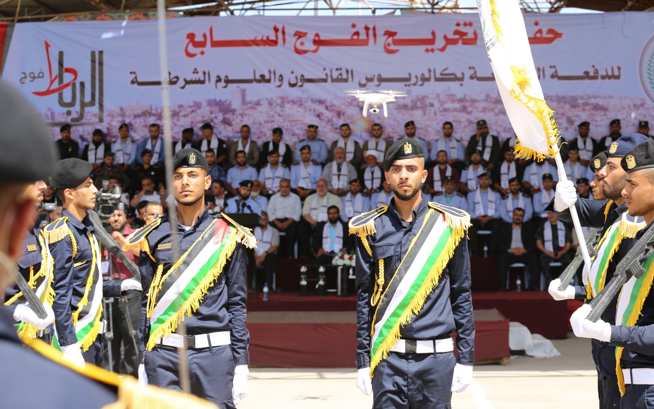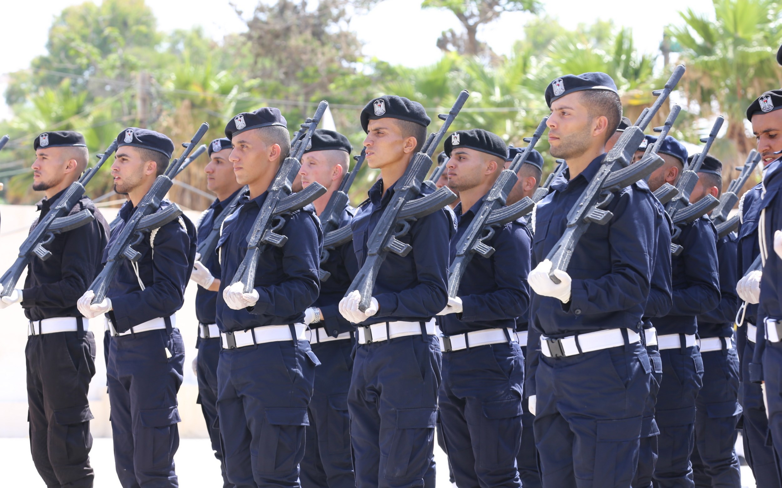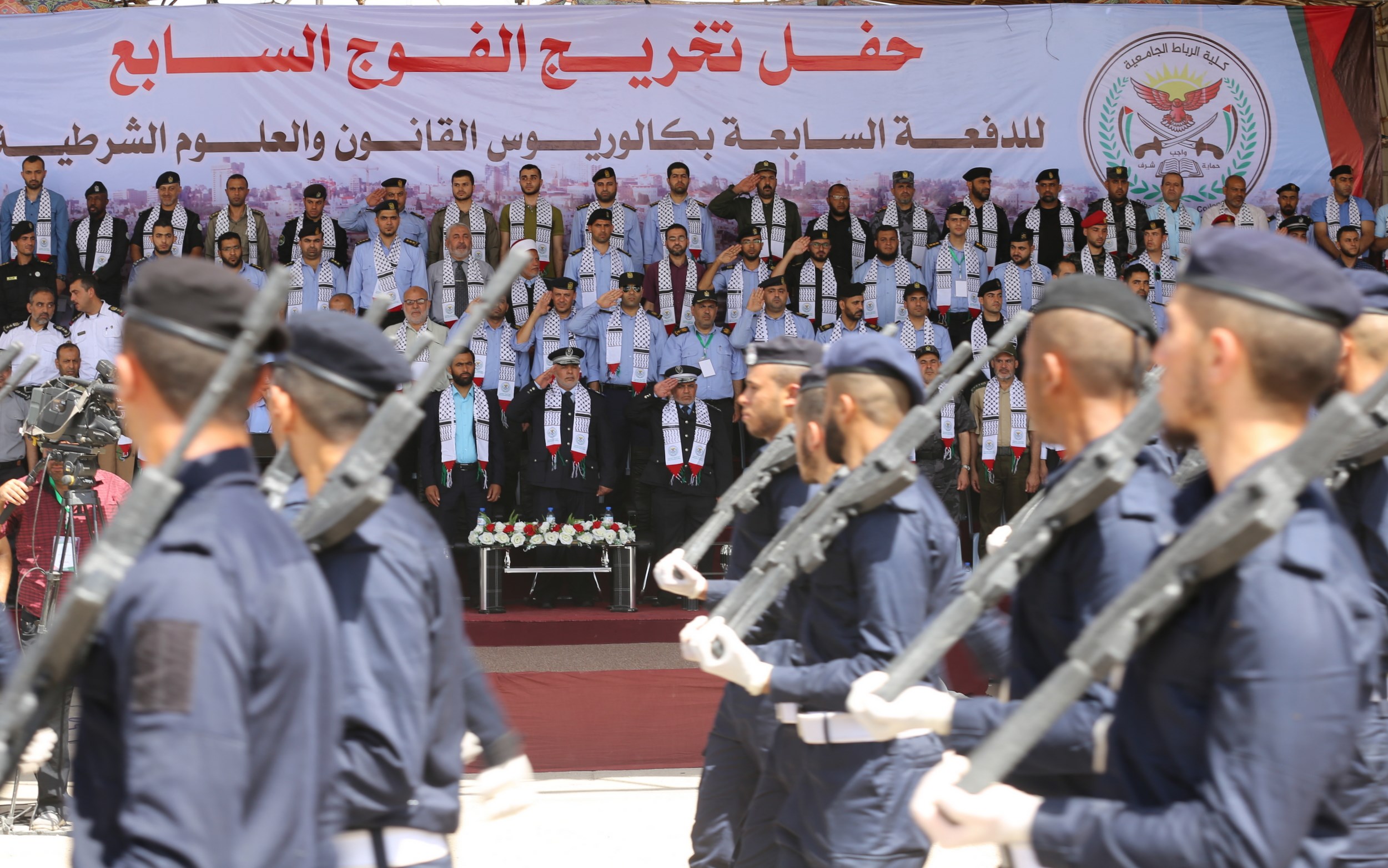 الطلاب وقادة الأجهزة الأمنية في ختام الحفل التحية للسلام الوطني الفلسطيني.
