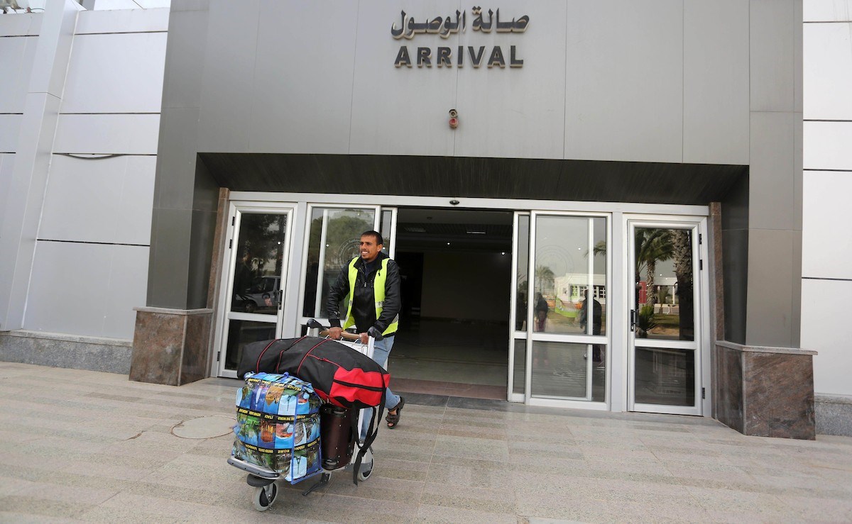 في الصالة الخارجية لمعبر رفح، واصطحاب أمتعتهم للسفر.