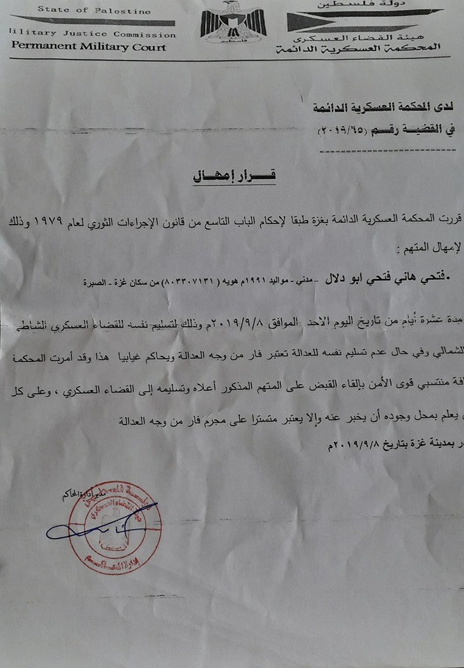 المحكمة العسكرية الدائمة التابعة لهيئة القضاء العسكري المتهم فتحي هاني ابو دلال