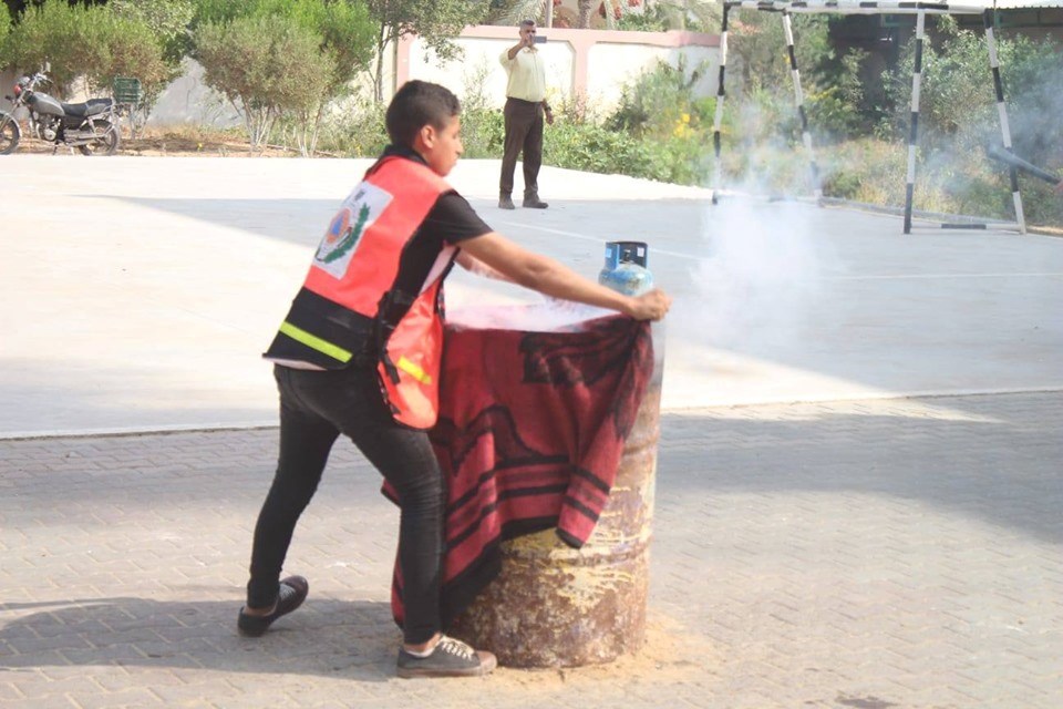رجال الدفاع المدني في تلك المناورة بعض من طلاب المدرسة في عمليات الاطفاء والاسعاف