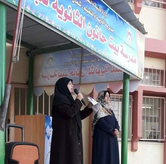 عزتي" خلال طابور الصباح لـ 500 من طالبات مدرسة بيت حانون الثانوية للبنات.