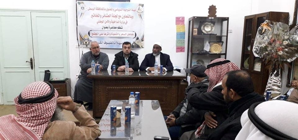 عقدت هيئة التوجيه السياسي والمعنوي في محافظة الوسطى، لقاءً تعبوياً للوجهاء والمخاتير بعنوان " مخاطر السحر والشعوذة وأثره على المجتمع"، بحضور كل من الرائد محمد جبر مدير التوجيه السياسي بالوسطى ، والداعية خالد العبيد من أوقاف الوسطى ، والأستاذ أحمد سلمان مدير الإدارة العامة للعشائر والإصلاح.