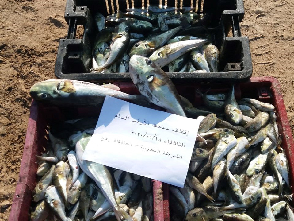 ضبطت مباحث التموين 30 كيلو من سمك الأرنب السام وبعد إشارة من الشرطة البحرية تفيد بوجود سمك يشتبه بأنه سام موجود عند صياد غرب رفح جنوب قطاع غزة.
