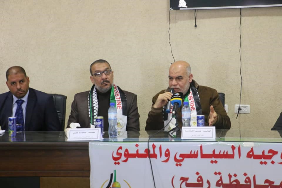 من جانب آخر، نظمت هيئة التوجيه السياسي والمعنوي بمحافظة رفح صالوناً سياسياً حول"صفقة القرن"الأبعاد والمخاطر وخيارات المواجهة" بحضور العميد محمد لافي رئيس التوجيه السياسي ود.يحي العبادسة النائب بالمجلس التشريعي والأستاذ أحمد المدلل أحد قيادات العمل الوطني وقادة الأجهزة الأمنية ومدراء الدوائر ورؤساء الأقسام والرتب السامية في المحافظة.